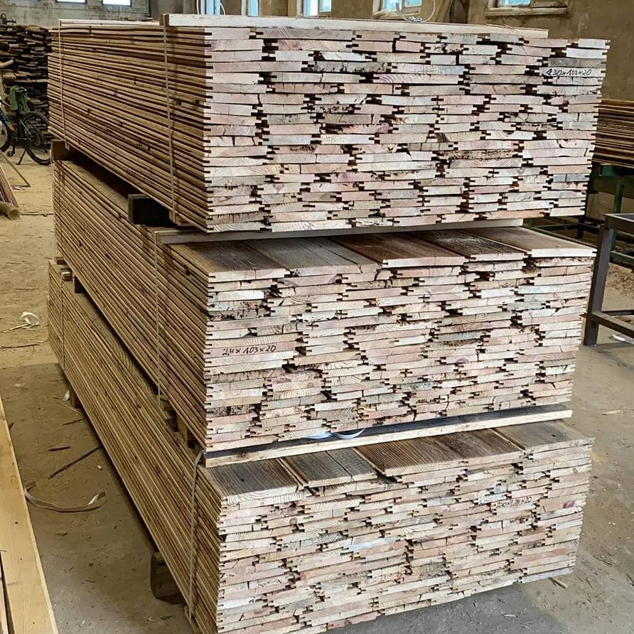 Nous démantelons de vieilles granges et d’autres bâtiments. Nous achetons principalement du pin, de l’épicéa, de l’aulne et du chêne, mais aussi du peuplier ou du sapin en plus petites quantités. Tous les matériaux que nous proposons proviennent de démolitions que nous effectuons en Pologne. Le bois brut de démolition ne contient pas de clous et peut également être séché.